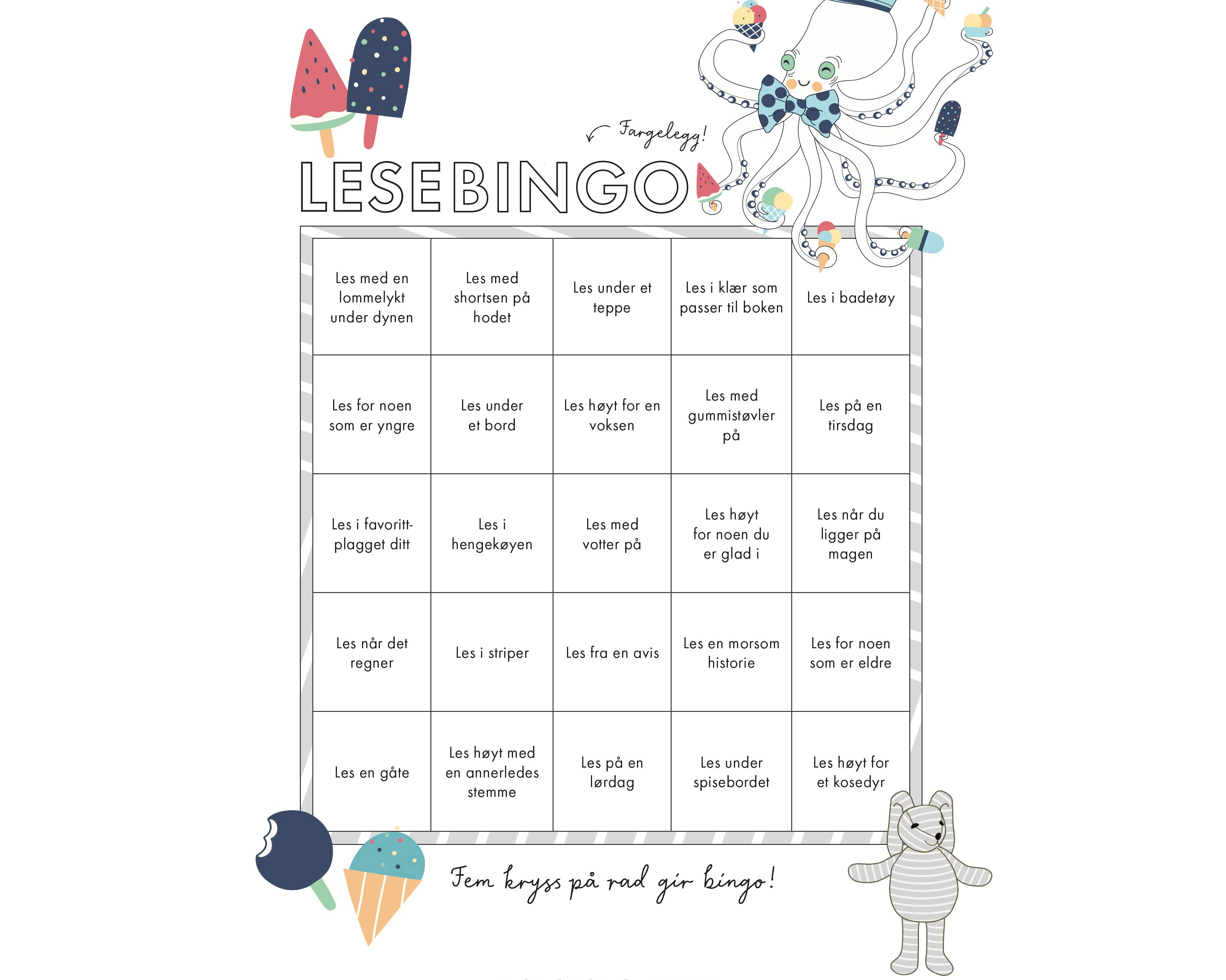 Inspirer og utfordre barna til å bli superlesere i sommer med Polarn O. Pyrets lesebingo! Skriv ut bingoarket og les sammenhengende i minst ti minutter for å krysse av en rute - Fem kryss på rad gir bingo. Kanskje den som roper bingo får et diplom, premie eller en is? Kun fantasien setter grenser!